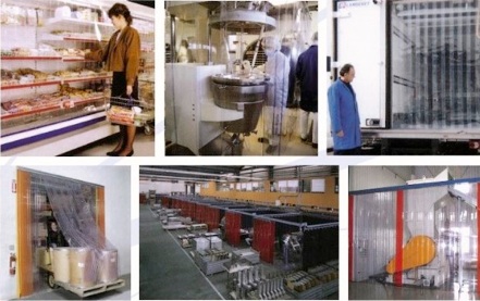 Mediante estas cortinas de plástico en PVC, se consigue una fácil separación de espacios, así como aislamiento térmico y son muy utilizadas tanto en la Industria cárnica y pesquera, como en industrias panaderas, laboratorios, hostelería, etc..